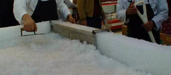 4. 將魚(yú)陳列好后,要在魚(yú)身上再薄薄地撒上一層冰,防止商品的風(fēng)干,降低商品的溫度和水分。注意不宜多撒,如果撒多了把魚(yú)埋住,一不能很好地展示商品,二由于冰水逐漸融化,上下的冰層會(huì)把魚(yú)包裹在中間,影響魚(yú)的鮮度。